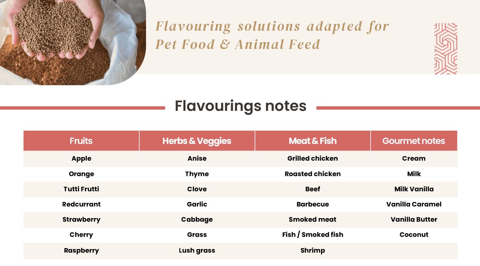 При этом ароматизаторы также помогают сгладить вкус рецептуры, убрать нежелательные ноты отдельных ингредиентов, которые часто используются в рецептурах по технологическим или экономическим причинам, и сделать общий вкусовой профиль корма более понятным и привлекательным.