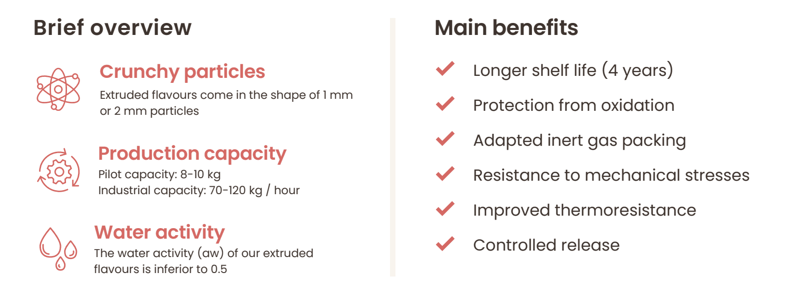 Особое значение имеет запатентованная Expressions Aromatiques технология инкапсуляции на основе экструзии, которая позволяет производить инкапсулированные ароматизаторы с высокой экономической эффективностью при стабильном качестве.