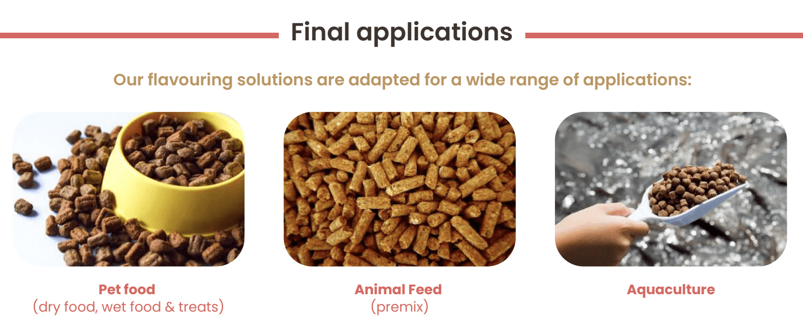 Корма для домашних животных ориентированы на вкус, аромат и общее восприятие продукта. Здесь важно, чтобы животное охотно ело корм, а владелец воспринимал его как качественный и правильный выбор для своего питомца.