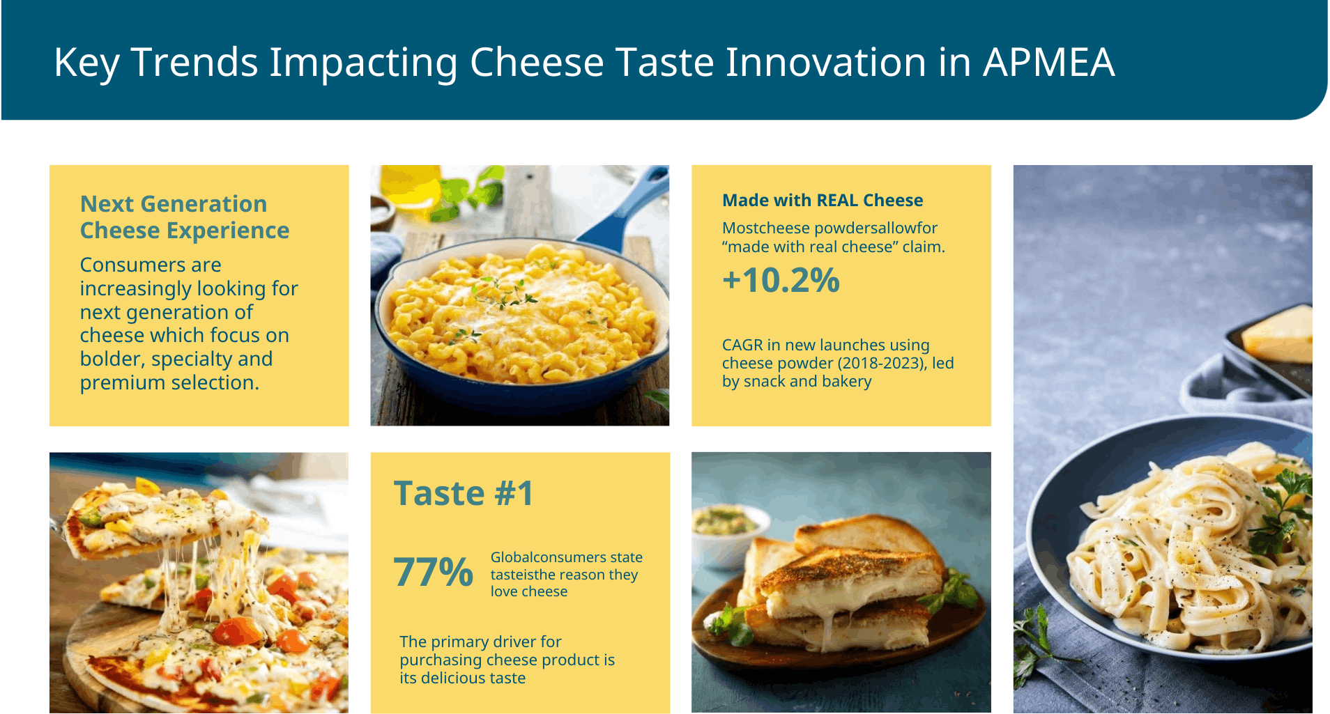 Сегодня потребители предпочитают более насыщенные, сложные и аутентичные сырные вкусовые профили, которые создают ощущение натуральности в продукте и усиливают удовольствие от еды.